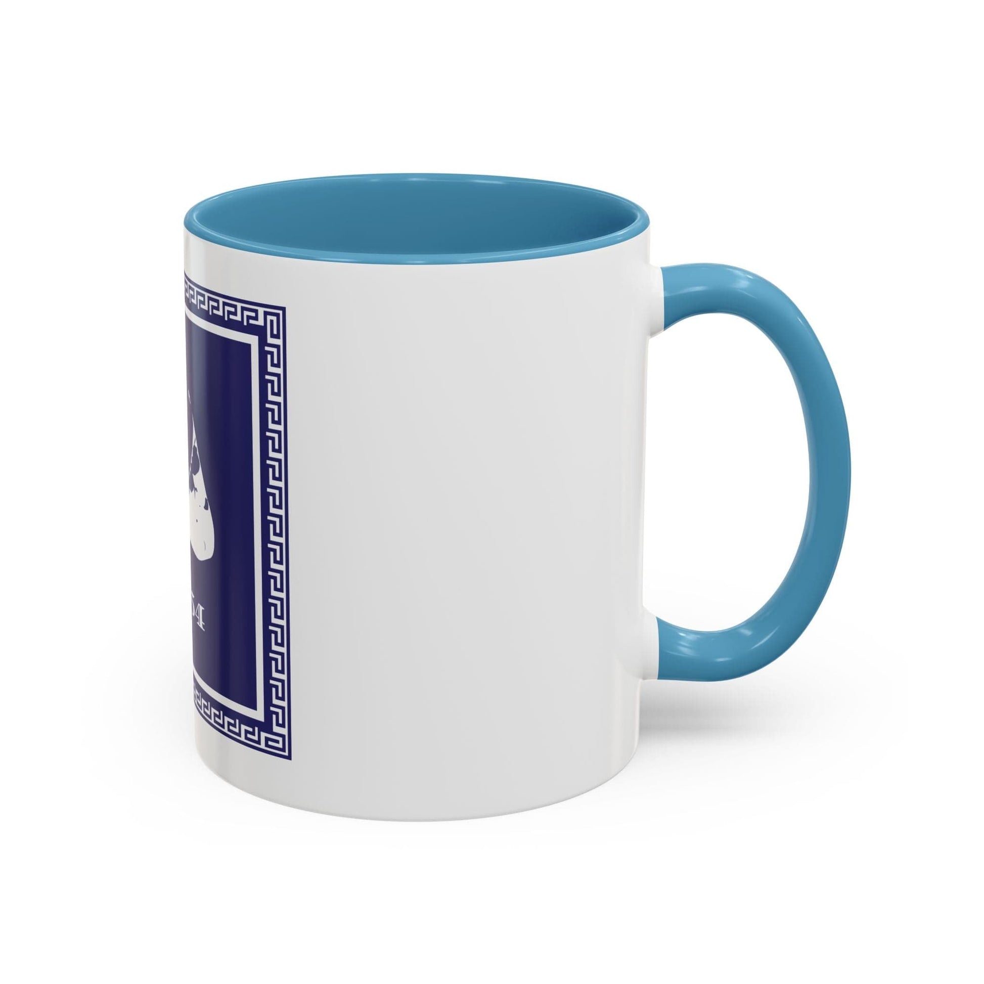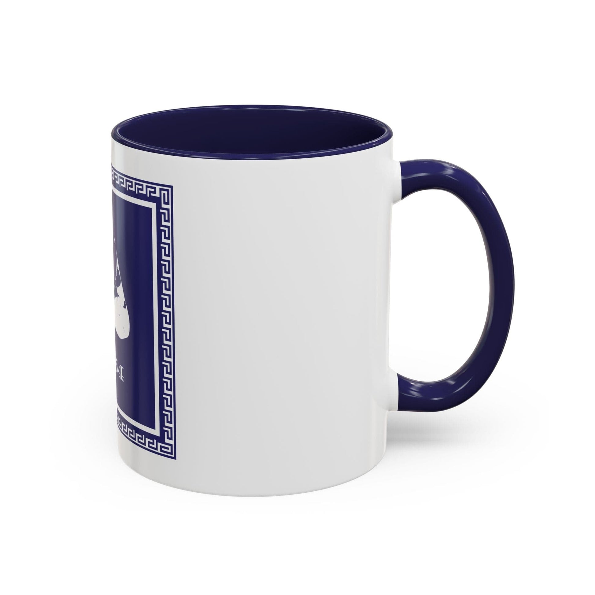 Navy and white Nantucket zip code coffee mug with a greek key surround. Perfect for those who appreciate classic design with a pop of color. Ideal for coffee lovers and those who enjoy a touch of coastal charm in their daily routine. Great for gifting on birthdays, holidays, or as a housewarming present.