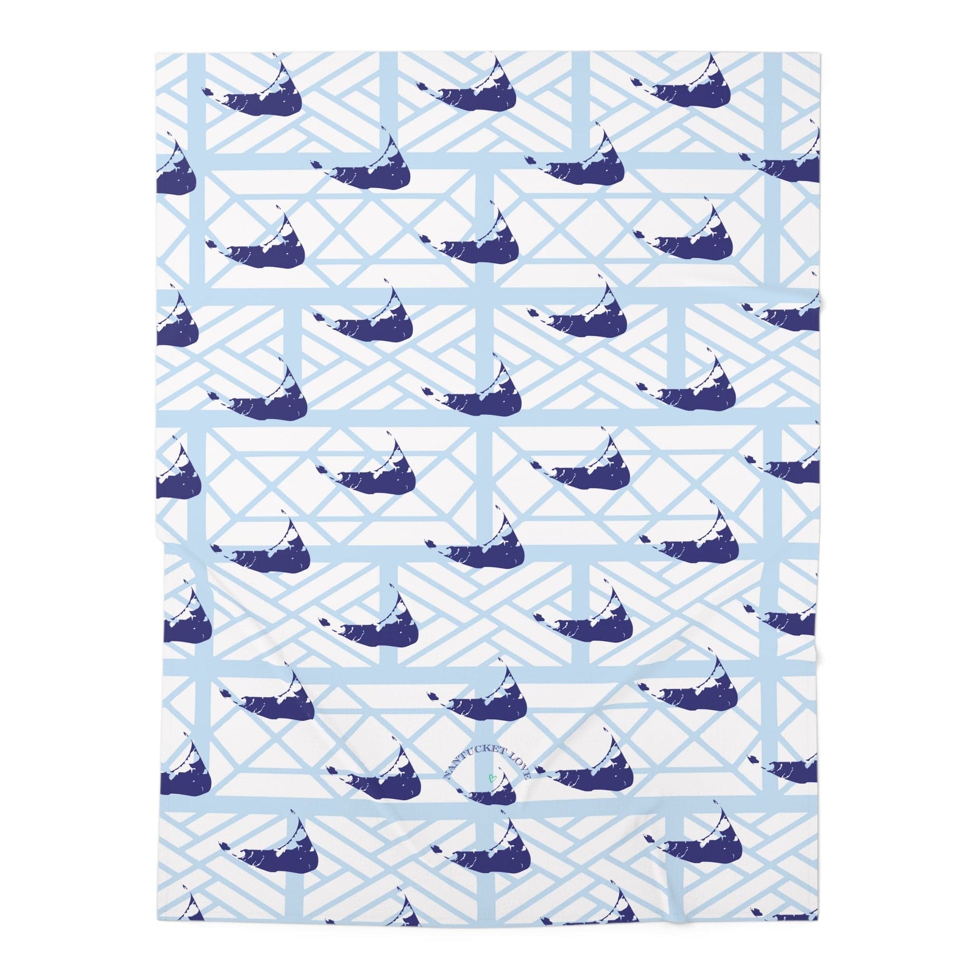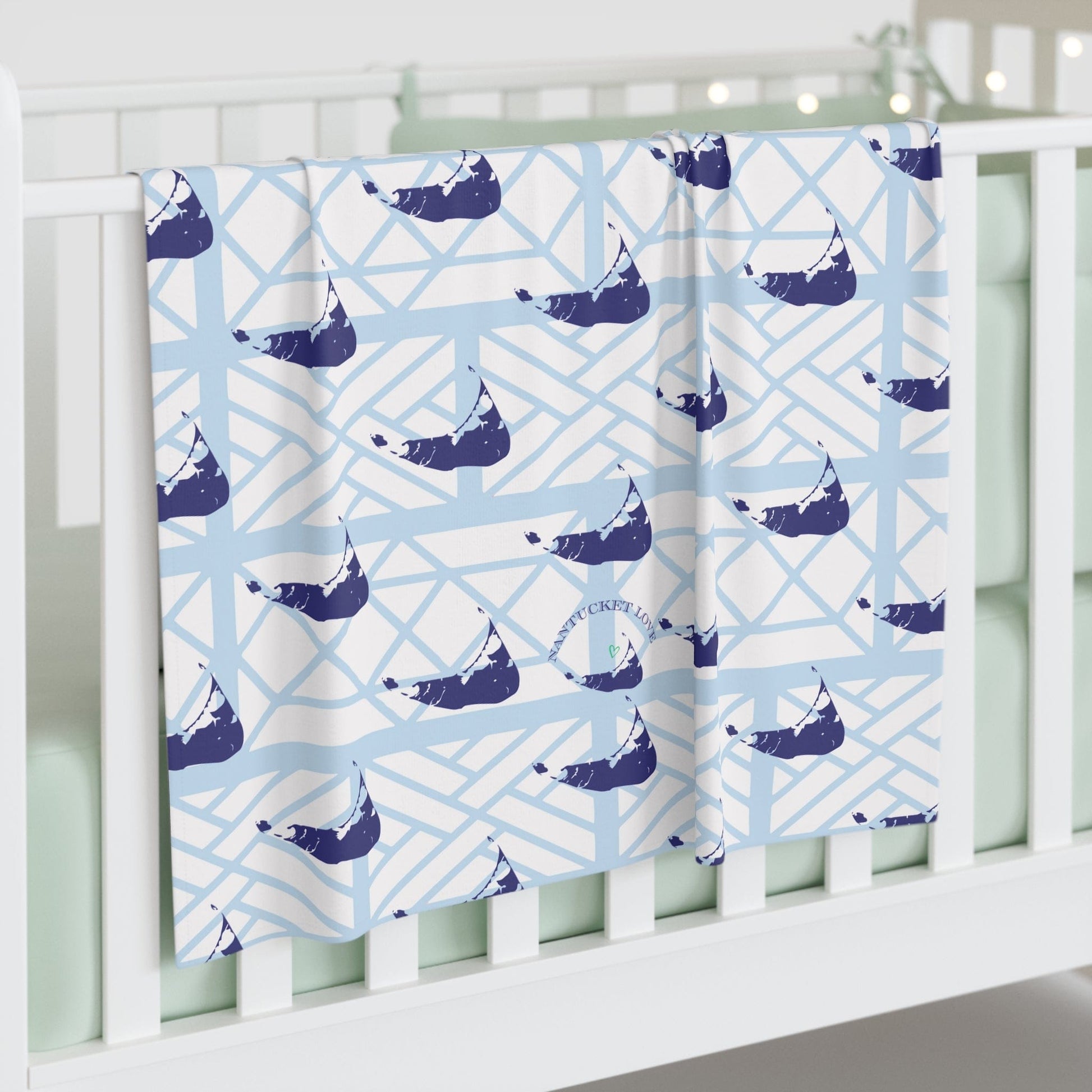 Our light blue Chippendale pattern makes the perfect background for your sophisticated Nantucket baby's Nantucket patterned blanket! The 100% jersey polyester blend that makes up our blanket is incredibly soft to the touch. Made in pre-constructed formatting, these blankets measure 30” x 40”. When washing, use cold water and tumble dry.
