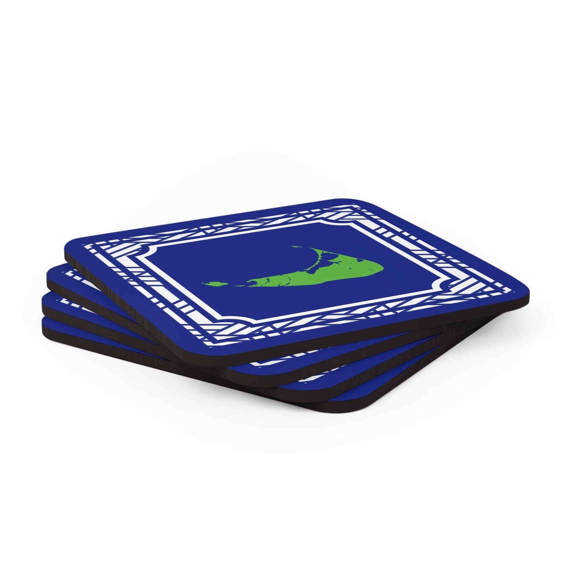 Our hand-illustrated caning in blue and white acts as a summery chic background for a navy and white center, on top of which sits a kelly green Nantucket Island. Blue and White with a fresh twist of Green! Each order includes four coasters (one size) that are made with a high-gloss top and feature a cork back to prevent sliding.