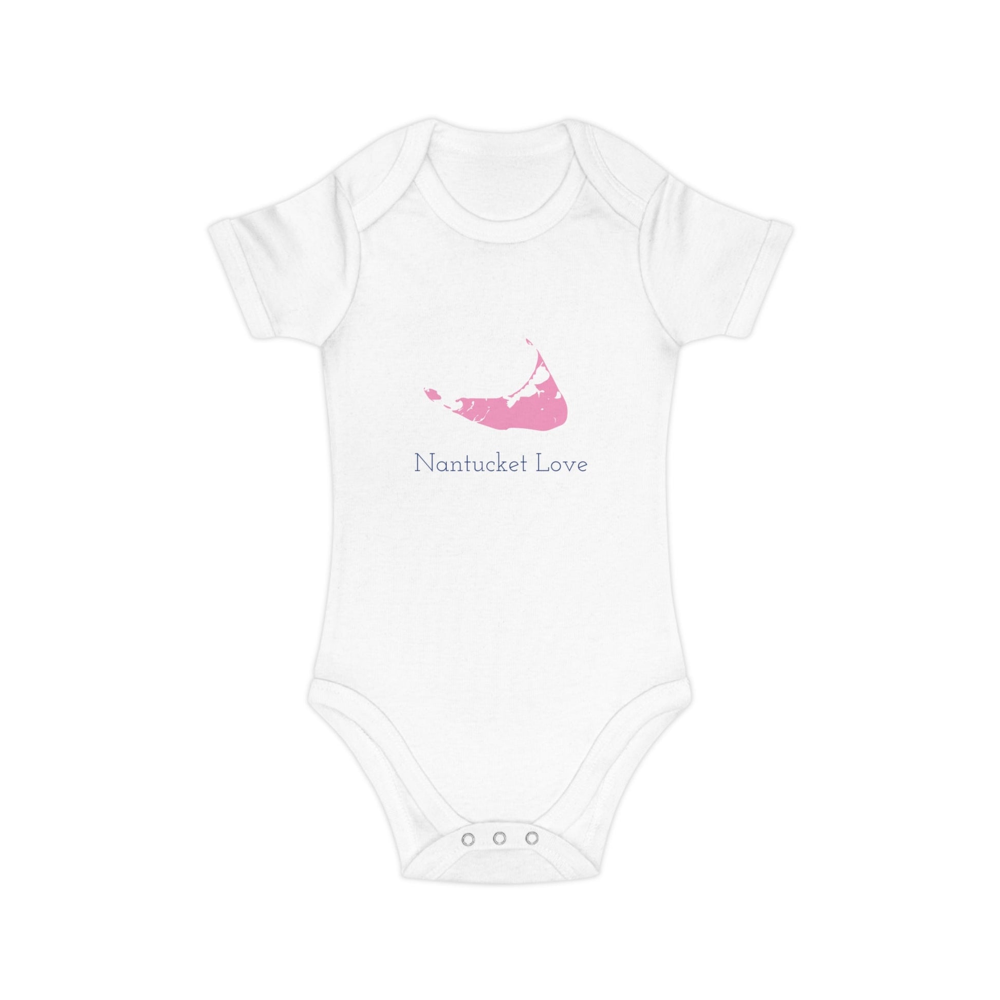 Dress your Nantucket baby in comfort and style with this sweet short-sleeved body suit featuring a light pink Nantucket Island with the words "Nantucket Love" underneath. The tee is made with 100% combed, ring-spun cotton. Each bodysuit tee features a bottom popper fastening for easy changing.