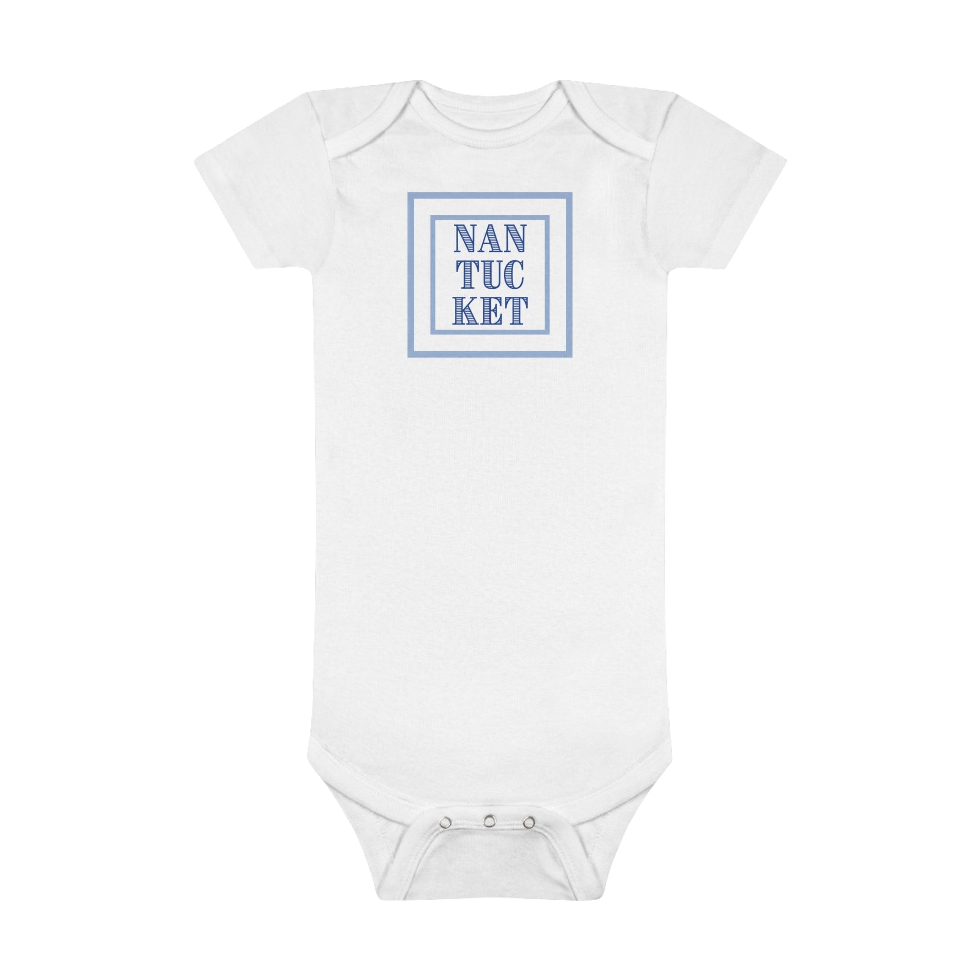 Our custom NAN TUC KET short-sleeve baby Onesie® in light blue, cornflower blue, and white is made from 100% cotton rib, which makes it perfect for newborns and toddlers. Dress your baby in the onesie and add a custom Nantucket blanket or towel, and you are set to go!