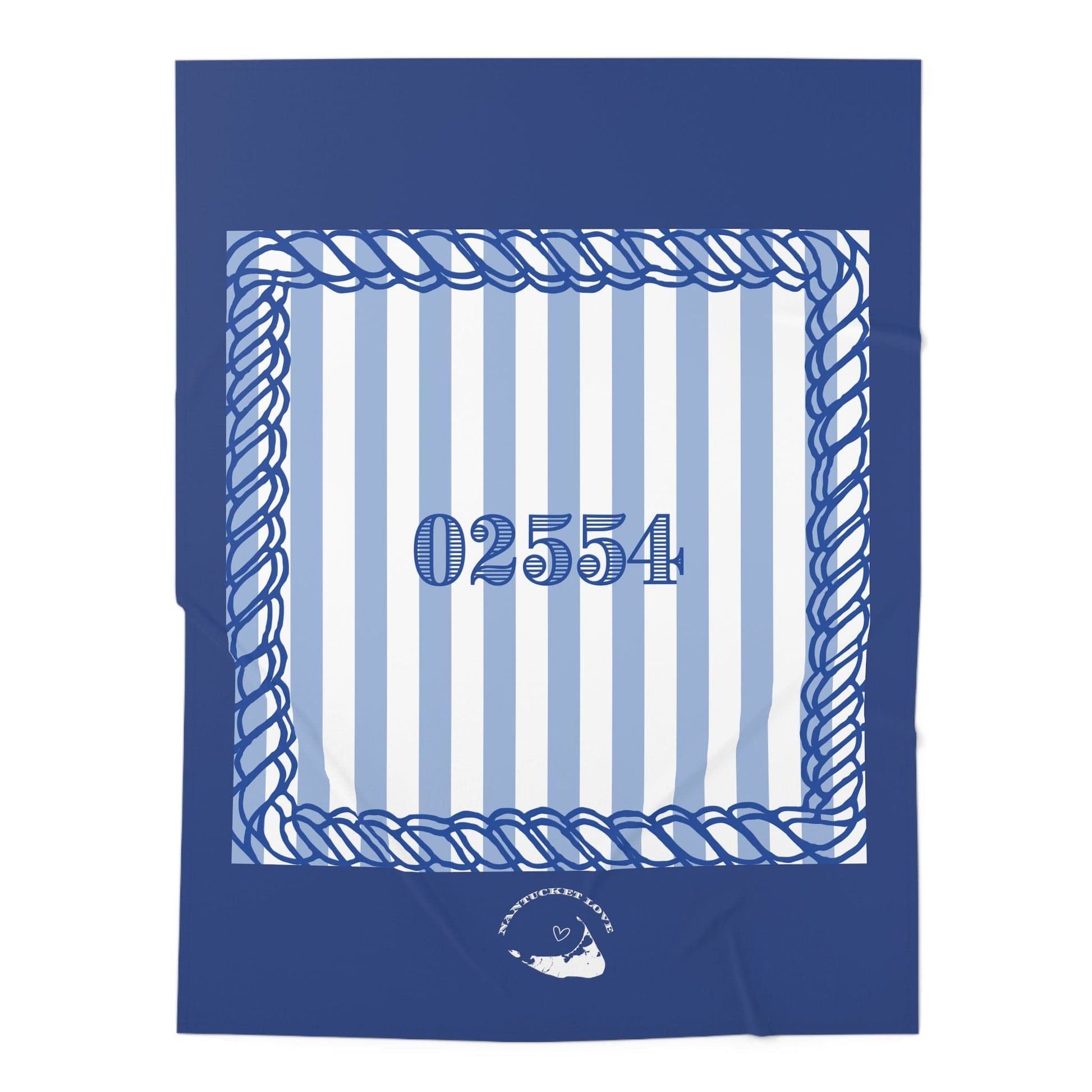 Our 100% jersey polyester blanket in navy blue features a light blue and striped square containing the 02554 zip code and then framed with rope. You'll never see another baby blanket like this one! A perfect "display" blanket for use on chilly days in the pram.