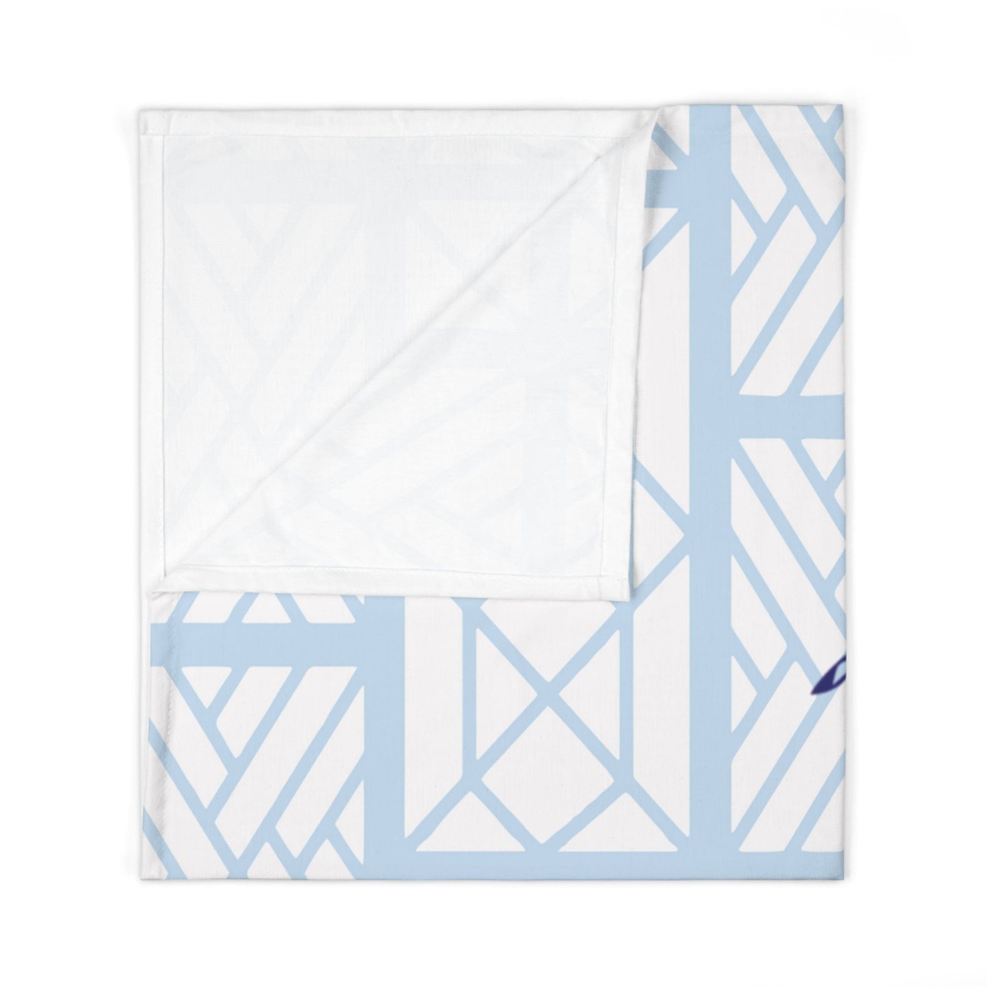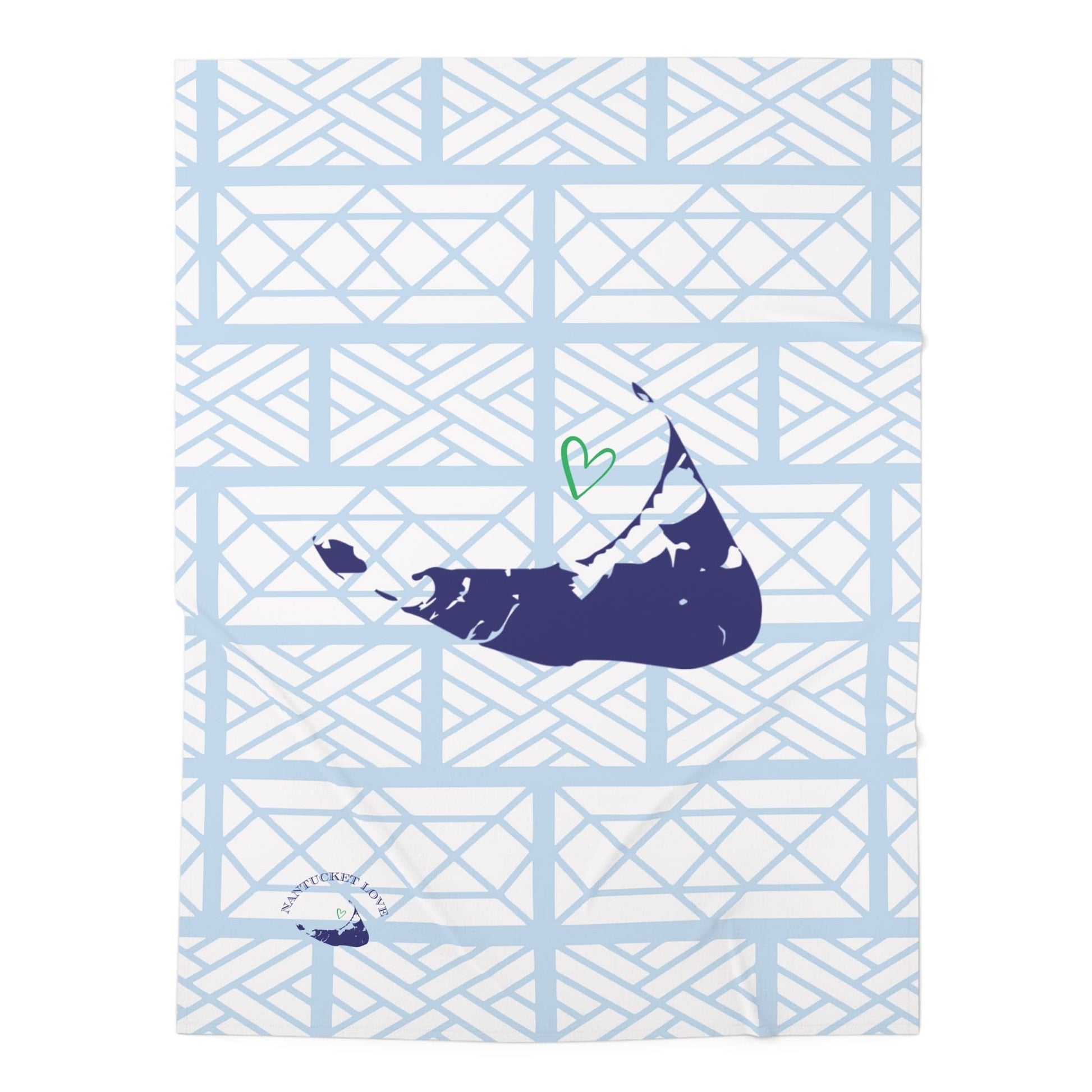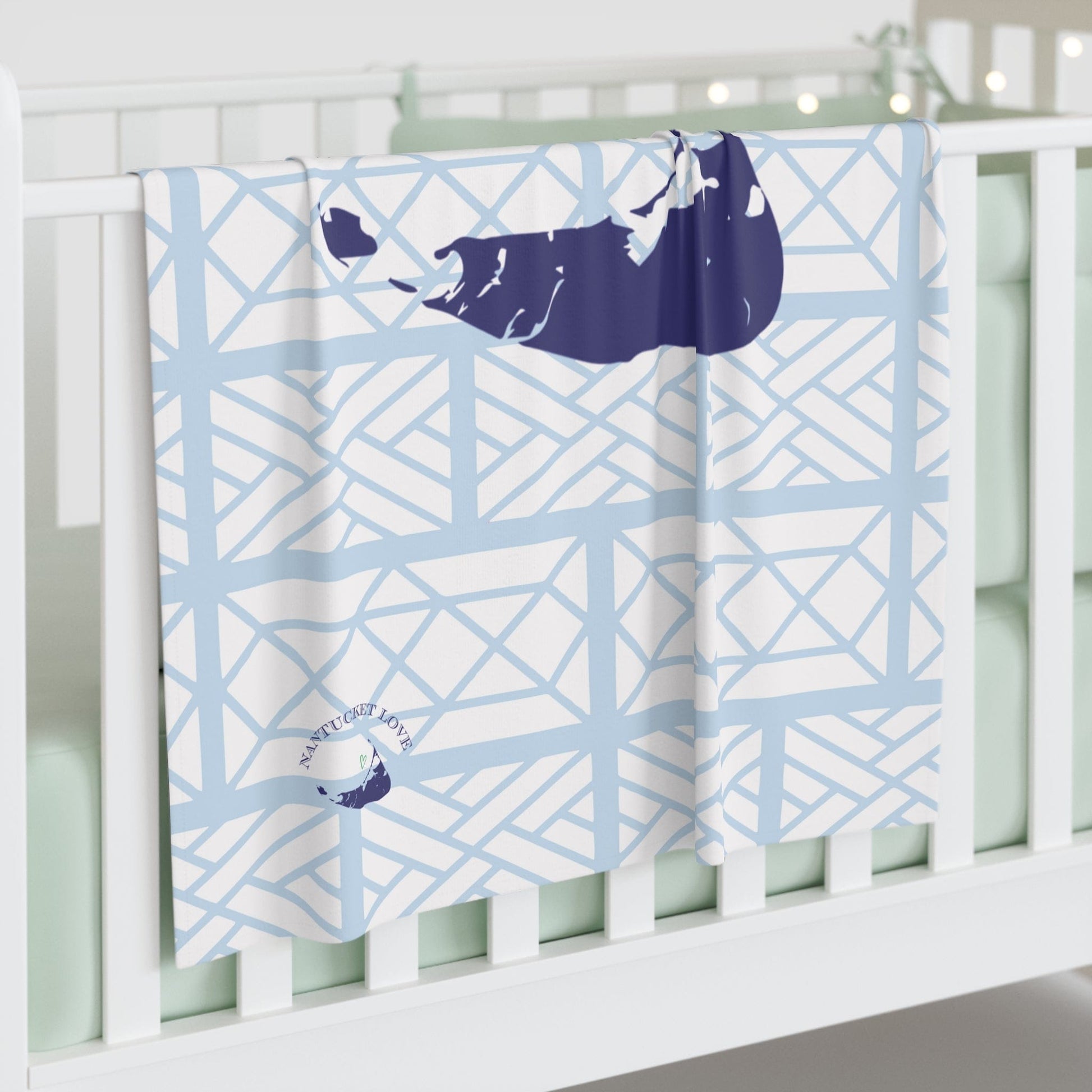 Our Nantucket Blue on Blue baby blanket features our Little Mountain Chippendale pattern as a backdrop to a large navy blue Nantucket silhouette. It's simple and sweet at the same time, and the 100% jersey polyester that makes up our custom baby blanket is incredibly soft to the touch. Made in pre-constructed formatting, the blanket measures 30” x 40”. When washing, use cold water and tumble dry.