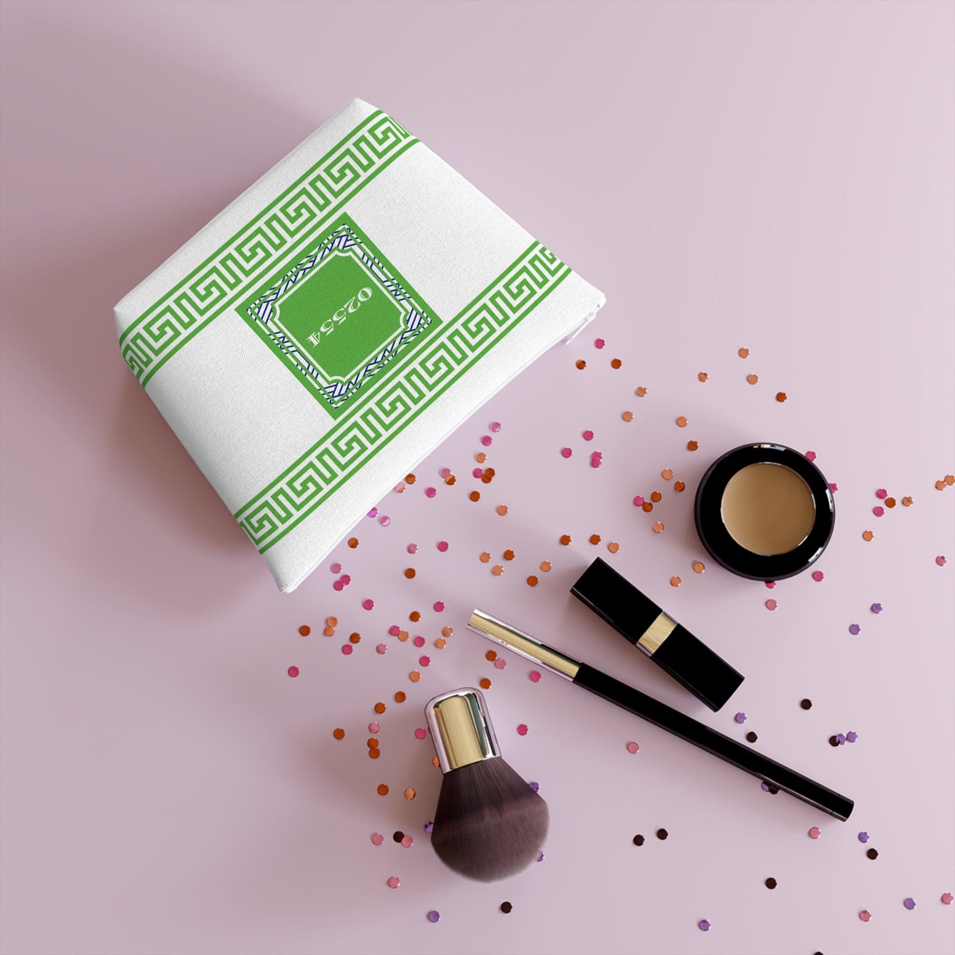 We love this bag! It is quintessential Nantucket--from the crisp white background and the bright green Greek Key borders to our beautiful bright cobalt and white Cane pattern that serves as a background for our bright green square and white Nantucket zip code. It's so fresh and pretty! And although we originally designed and used it as a cosmetic bag, we've also found it quite useful for chargers, sun protection, nail polish, and hair ties....