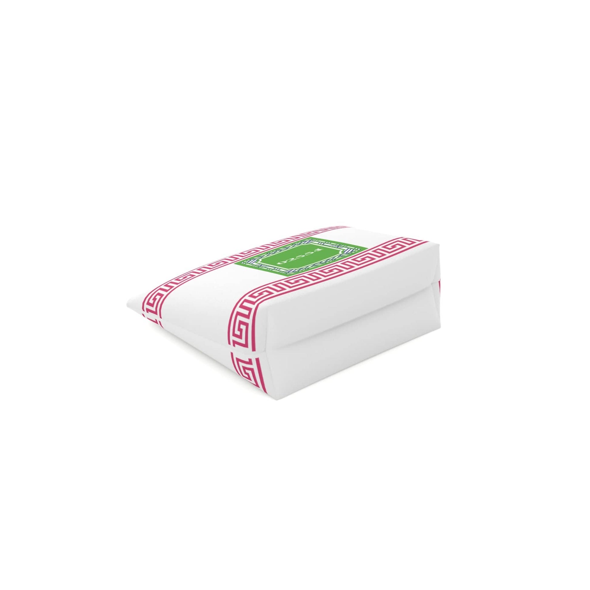 We love this bag! It is quintessential Nantucket--from the crisp white background and the raspberry pink Greek Key borders to our beautiful bright white cobalt Cane pattern upon which our bright green Nantucket zip code rests, is just so perfectly pretty! And although we originally designed and used it as a cosmetic bag, we've also found it quite useful for chargers, sun protection, nail polish, and hair ties....it also makes a great gift!