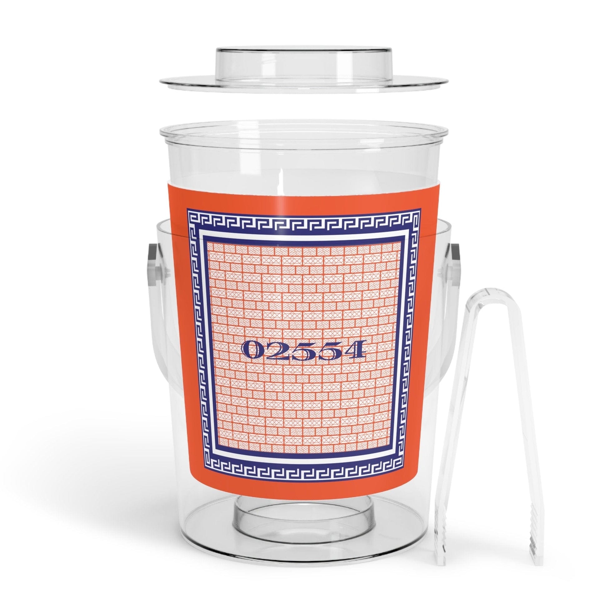 Bring a Nantucket touch to any gathering that requires frosty beverages with this Nantucket zip-code ice bucket. You won't find our Hand-painted Orange Chippendale Pattern with crisp Blue Zip Code and Blue and White Greek Key element design anywhere else! Each acrylic ice bucket comes with its own tongs and has a 3 QT (96oz) capacity. What's more, you also get an easily removable lid that adds convenient handling to the mix. Great for Wedding, Housewarming and Hostess gifts!