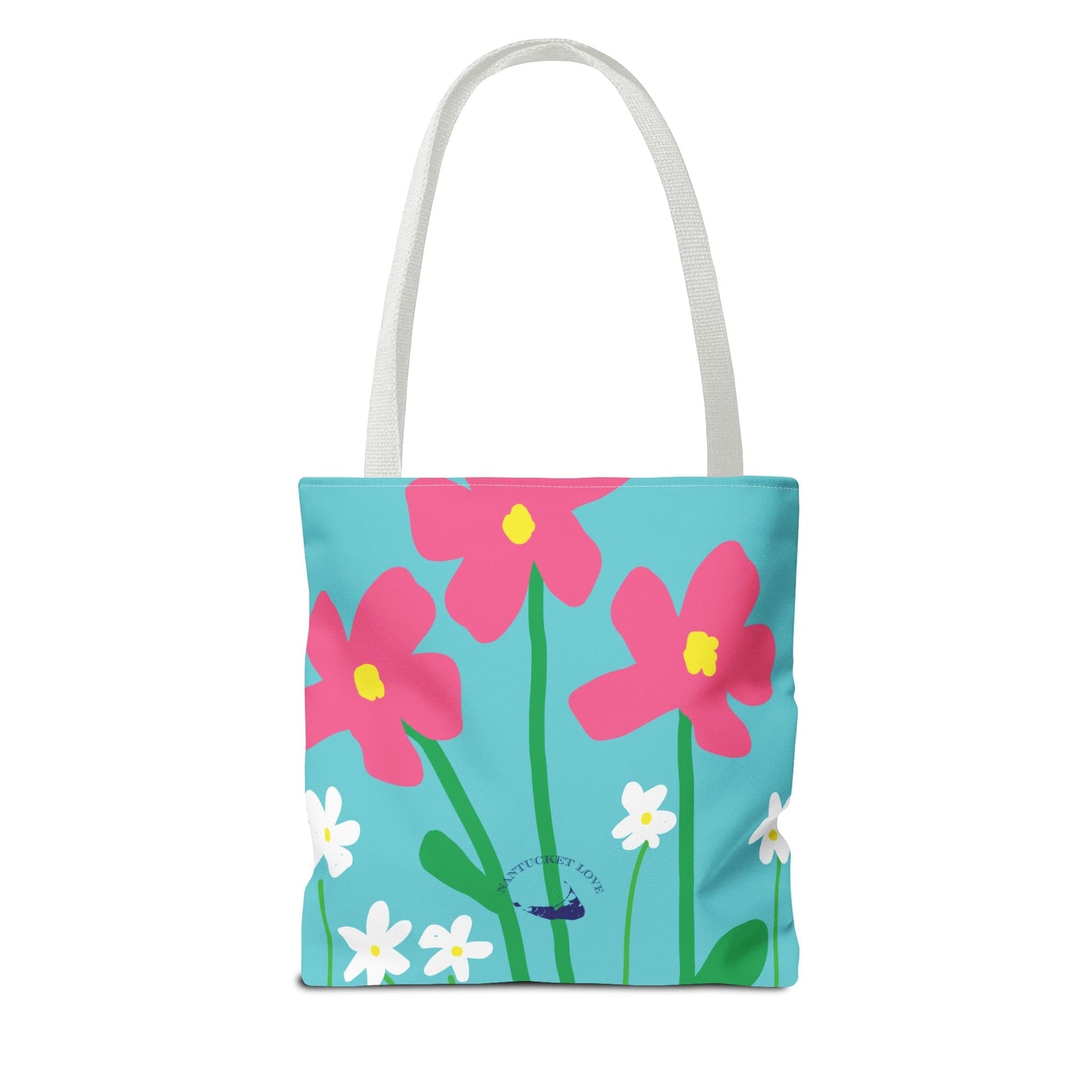 Our favorite Nantucket Cosmos in pink and white, paired with our bright robin's egg blue background, make this tote come alive. Perfect as a beach bag, shopping bag or even just a tote for carrying around Town!