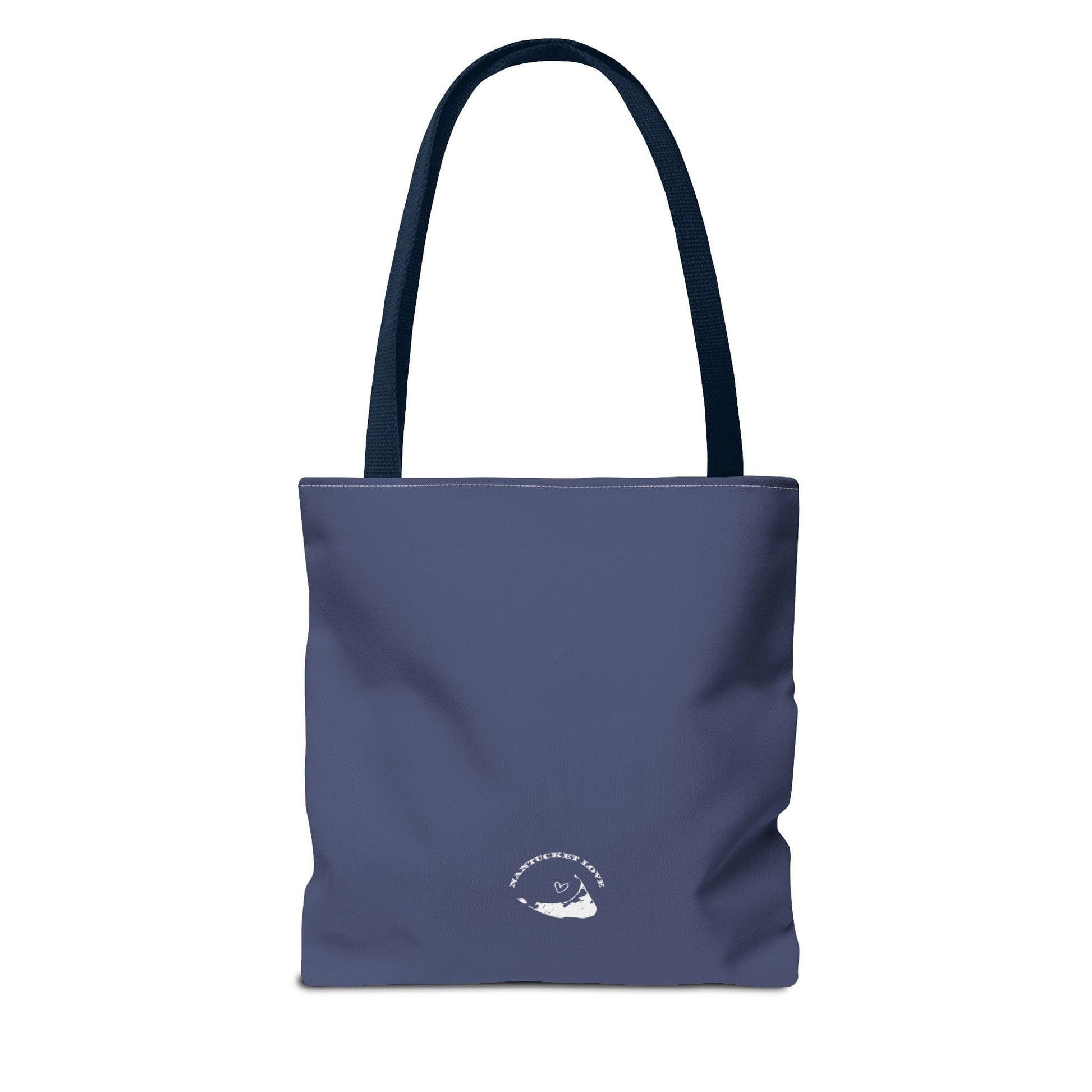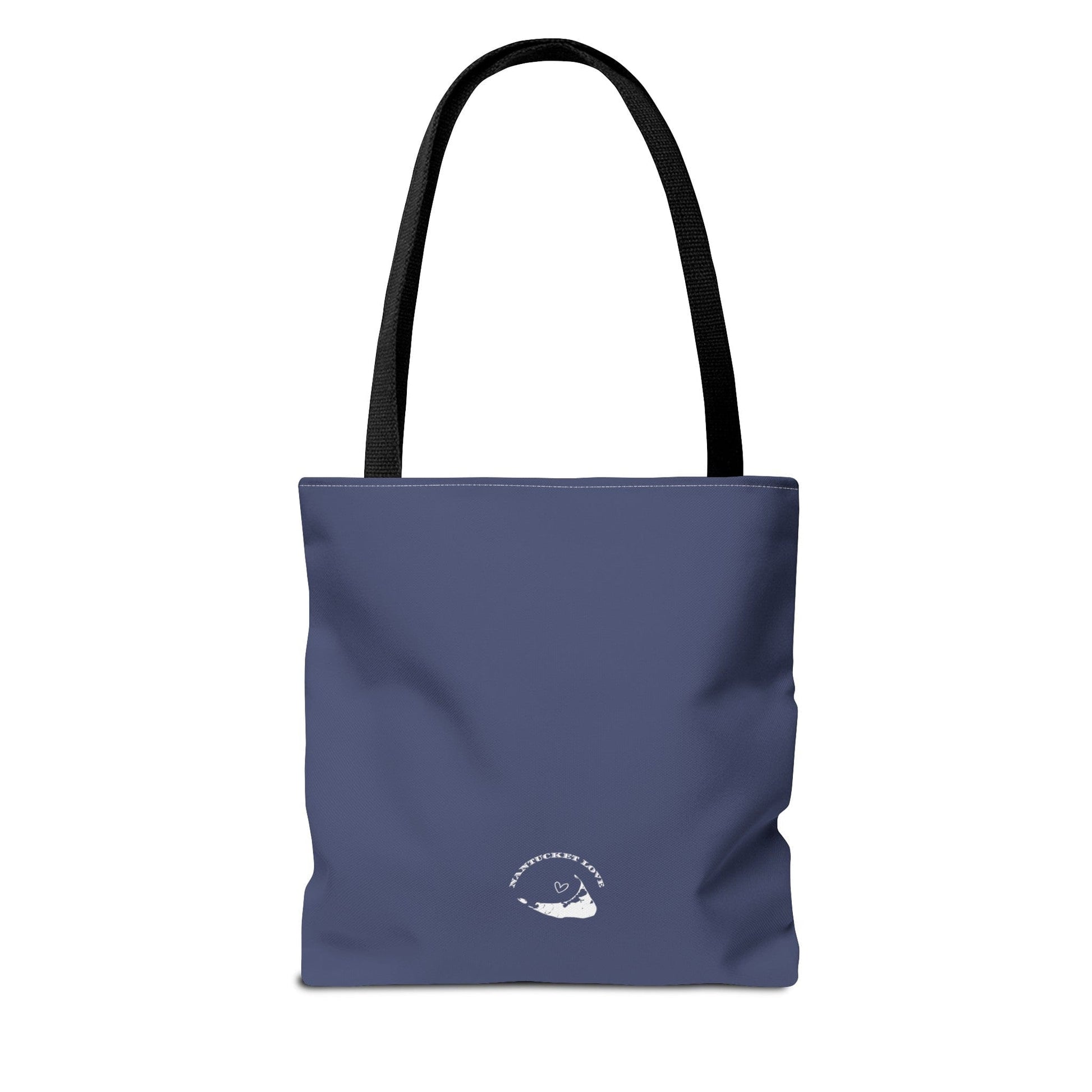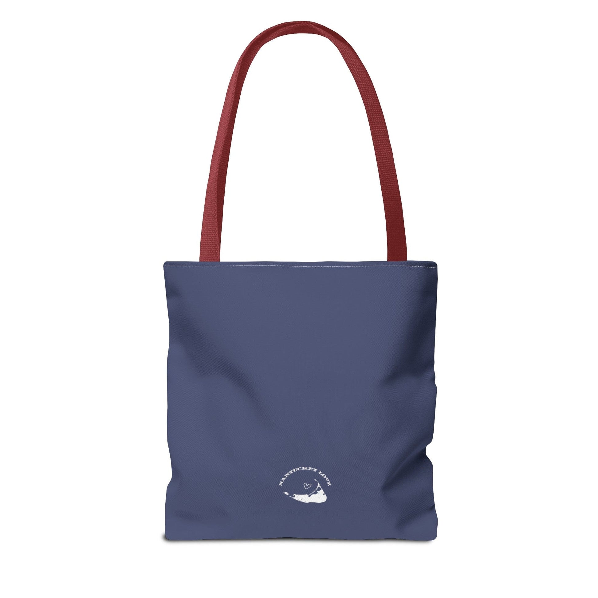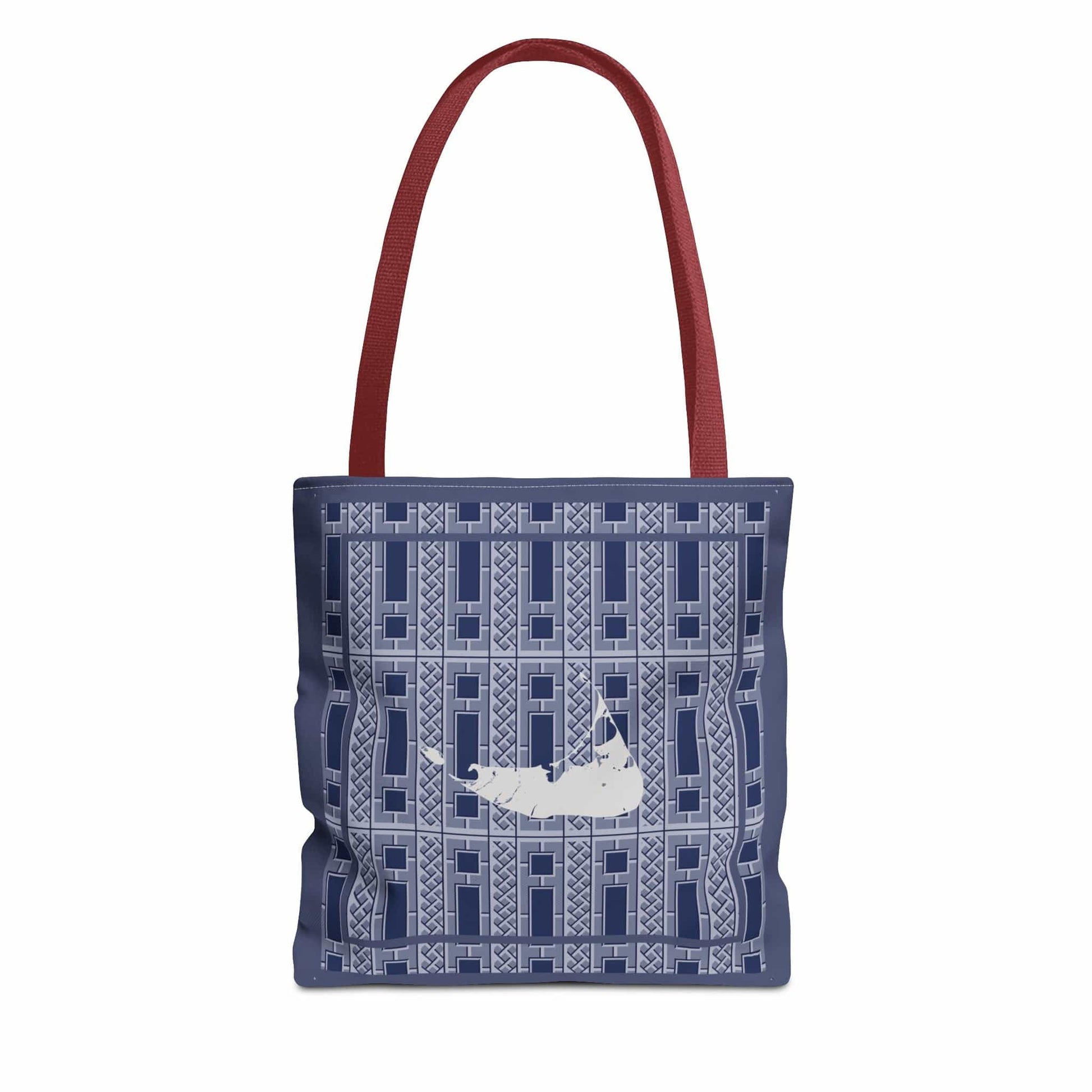 Our gray and blue lattice background is such a pretty colorway! And the light gray Nantucket silhouette really pops against the unique background. This tote, while pretty, is also huge on the functionality scale. The custom-printed tote bag comes with your choice of two handle colors (though we'd suggest the navy to make the entire bag one that's good at "hiding" dirt!). And because the bag is made with spun polyester, it features double-stitched seams, cotton webbing straps, and nonwoven laminate lining for high-end durability. In other words, you can go from beach to town to Stop & Shop with this one bag!