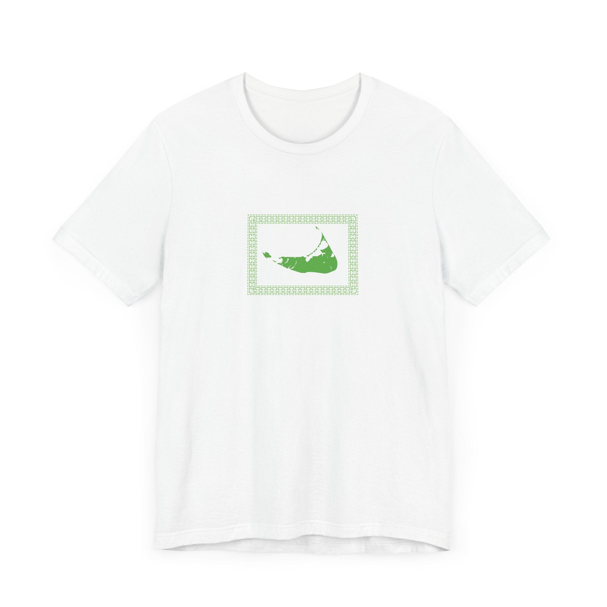 This classic unisex jersey short-sleeve tee features a green Nantucket surrounded by a rectangular Greek key border. It looks and fits like a well-loved favorite. With knit collars to bolster shaping, tapered shoulders for a better fit over time, and dual side seams to hold the tee's shape for a longer period of time, this shirt should become a summertime favorite.
